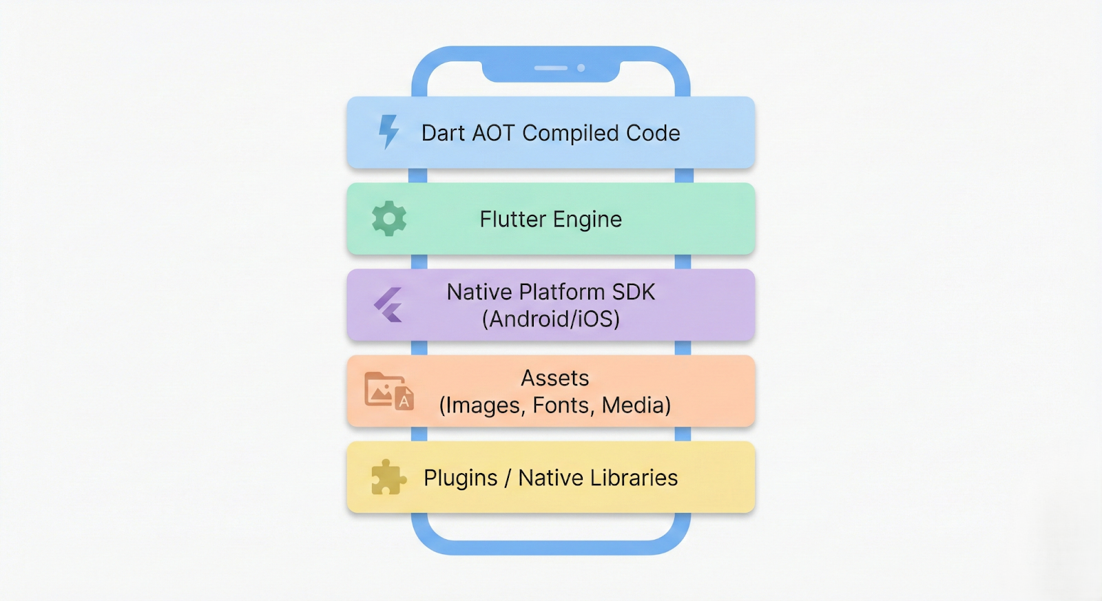 A Flutter application package (APK/AAB or IPA) fundamentally includes the following components: